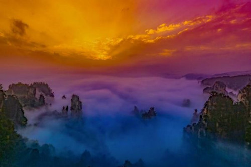 武陵源的風(fēng)光是旖旎醉人的,是淋漓酣暢的,是光彩奪目的。醉人的景色讓你如癡如醉,酣暢的景色讓你浪漫舒懷,奪目的景色讓你流連忘返。金秋時(shí)節(jié),萬山紅遍,野果飄香尤如一首首動(dòng)人的詩篇,冬季里的峰海雪原,莽莽蒼蒼、氣象萬千,峰頂?shù)膭潘?,昂首迎雪尤如一幅幅美麗的圖畫。武陵源是峰的世界,峰的海洋,水的源頭,云的故鄉(xiāng)。徜徉其間,心曠神怡,留連忘返。