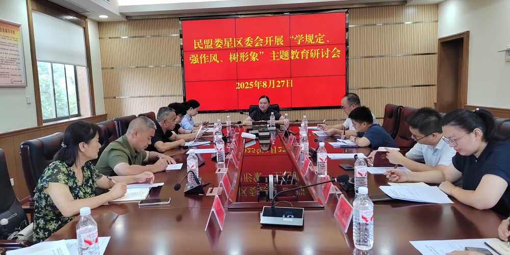 2025年8月27日,民盟婁星區委會在區統戰系統會議室召開“學規定、強作風、樹形象”主題教育研討會,會議由區政協副主席、民盟區委會主委王文成主持,全體盟區委委員和基層支部主委參加會議。