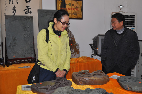 邵瑛(左)等在視察國(guó)藩溪硯廠