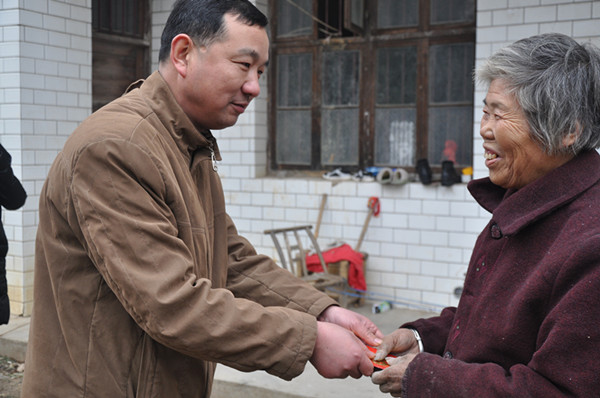 羊小慶(左)為村民送上慰問(wèn)金