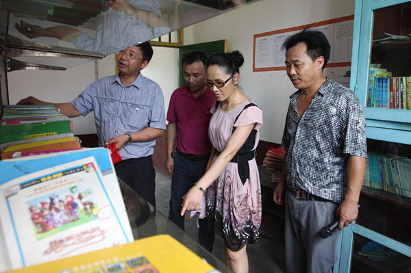 邵瑛(右2)陪同長沙礦冶研究院黨盟代表團在惠民學校了解婁底民盟圖書室建設情況