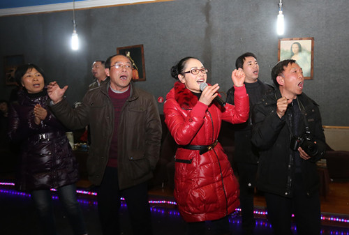 邵瑛主委在新春聯(lián)歡會上和盟員們高唱《團結(jié)就是力量》。