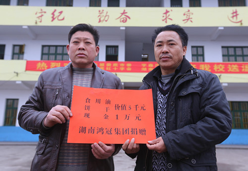 湖南鴻冠集團(tuán)贈(zèng)送1萬(wàn)元現(xiàn)金,價(jià)值5千元的餅干、食用油給惠民學(xué)校。