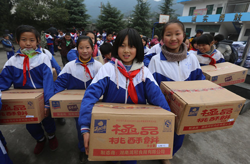 惠民學(xué)校學(xué)生搬運(yùn)湖南鴻冠集團(tuán)贈(zèng)送的餅干慶新年。