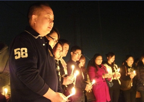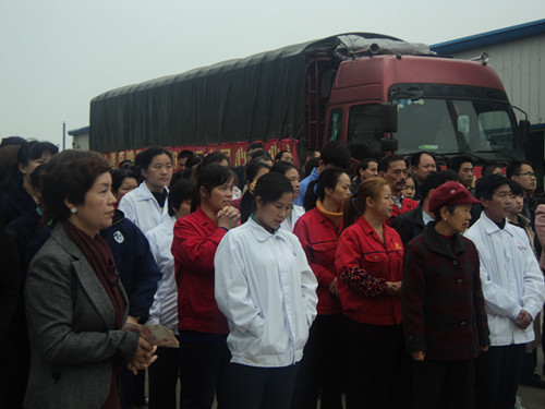 潘杰(左1)與集團(tuán)全體員工一道為雅安祈福