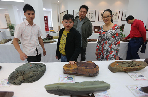 張伯序(左2)、邵瑛(右2)聽羅湘科(左3)介紹溪硯(郭國權攝)