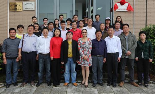 邵瑛(左2)、張伯序(右2)等為民盟文化藝術工作委員會揭牌(郭國權攝)