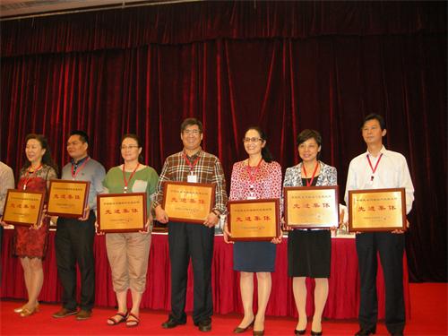 2013年10月10日,邵瑛(右3)上臺領取民盟中央組織發展工作先進集體獎。歐貽宏攝影。