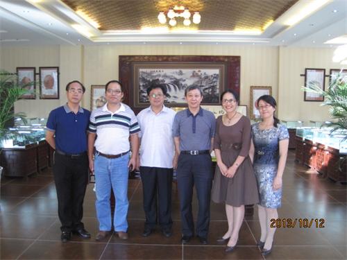 2013年10月12日,陳幼平(右3),在趙為濟(左1)邵瑛(右2)、徐智(右1)、翟見宇(左3)等陪同下,到盟員企業家陳春節(左2)創辦的雨花石展覽館參觀并合影。