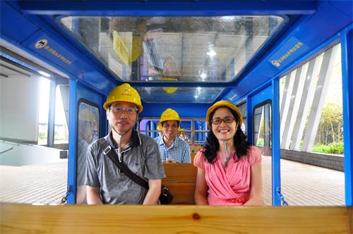 邵瑛(右)一行乘小火車下礦井參觀。羊小慶攝影。