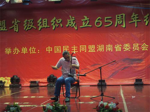 會后,紀念湖南民盟省級組織建立65周年文藝表演精彩上演。本次演出由民盟湖南省委員會主辦、盟員自編、自導、自演,充分展示了湖南盟員的風采,表達了對民盟組織的熱愛。省二胡協會副會長、婁底盟員譚明哲表演的二胡獨奏《賽馬》贏得觀眾陣陣掌聲。