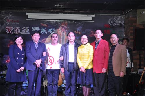 趙為濟(中)在邵瑛(右3)陪同下視察盟員譚明哲(左3)創辦的愛樂吧