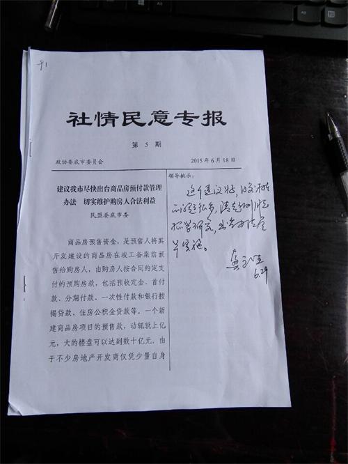 2015年6月18日,婁底市政協第5期社情民意專報刊登了民盟婁底市委關于《建議我市盡快出臺商品房預付款管理辦法  切實維護購房人合法利益》社情民意信息,得到了中共婁底市委書記龔武生高度重視并批辦。