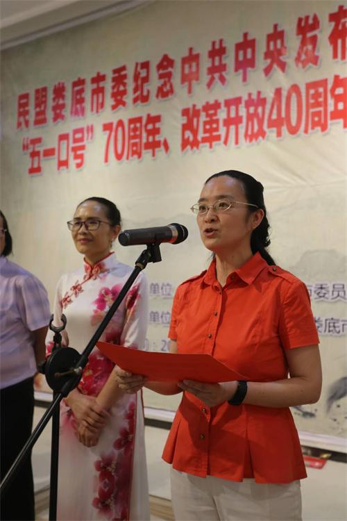 邵瑛在開幕式上作主題講話。她和大家一起重溫了70年前民盟響應中共中央“五一口號”、40年前中共十一屆三中全會決定我國全面實行改革開放的歷史。她指出,民盟婁底市委用藝術作品展的形式,來紀念這兩段波瀾壯闊的黨史、國史、革命史、建設史和多黨合作歷史,就是要從中汲取砥礪前行的力量,傳承老一輩盟員的政治信念和高尚情操,堅定正確方向、牢記使命,不忘合作初心,鞏牢共同思想政治基礎。她號召全市盟員進一步深入學習貫徹習近平新時代中國特色社會主義思想,學習中國共產黨自我完善、永葆生機活力的智慧和勇氣,共同把我國社會主義政黨制度堅持好、發展好、完善好;不斷加強民盟自身建設,增強履職能力,做中國共產黨的好參謀、好幫手、好同事,為婁底的各項事業進步,為實現中華民族偉大復興中國夢,履職盡責再立新功!