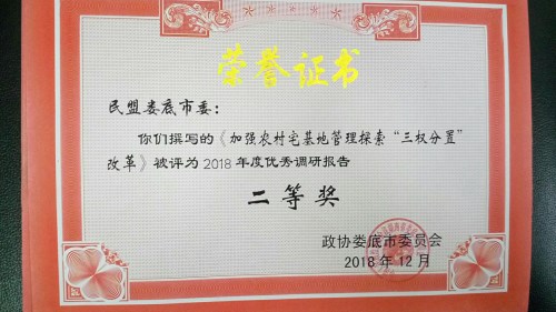 獎”、“婁底市政協2018年度優秀理論文章三等獎”。民盟市委2018年重點課題調研報告《加強農村宅基地管理,探索“三