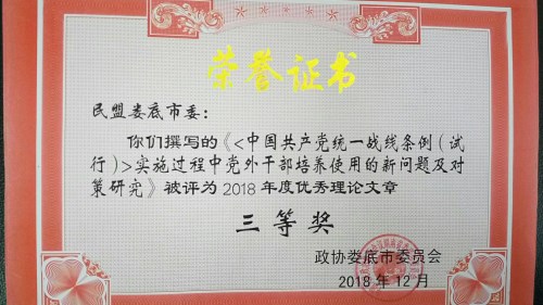 一戰線條例(試行)>實施過程中黨外干部培養使用的新問題及對策研究》,獲評“民盟省委統戰理論研究論文三等