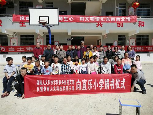 上午,黨支部和民盟支部在新化縣水車鎮直樂村直樂小學聯合舉辦了以“大力推廣普通話,助力脫貧攻堅戰”為主題的志愿活動。兩個支部向學捐贈了總價值達八千余元的各類圖書432冊。本次捐獻的書籍大部分是適合孩子們閱讀的經典國學、詩文、童話故事以及其它有益于孩子們身心健康的課外書籍,目的就是助力開拓貧困村孩子們的閱讀視野和思維,在書中探尋世界,在書中增長見識;豐富孩子們的課外生活,讓孩子們愛上學習,愛上閱讀,享受閱讀,在閱讀中學習普通話。捐書活動現場,民盟盟員、中國作家協會會員、中國寫作學會雜文專業委員會常務委員、湖南省作家協會教師分會副主席、《讀者》《特別關注》《格言》《幽默與笑話》等刊簽約作家,婁底市作協副主席,文學院副教授游宇明現場簽名捐贈了自己的文學作品。民盟湖南人文科技學支部主委、教務處副處長謝四連教授向孩子們講述了說好普通話、讀好書的重要性,并承諾湖南人文科技學院教務處黨支部民盟湖南人文科技學院支部以后每年向直樂小學捐贈一批圖書,把圖書借閱室管好建好。