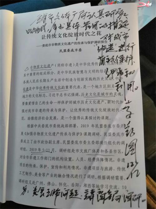 李薦國在聽完調研成果匯報后指出,今年各民主黨派、工商聯和無黨派人士參政議政調研,選題切口小,容量大,關注度高;調研深入細致,內容詳實具體;所提的建議富有針對性、操作性,很有價值,是高質量的調研成果。李薦國要求,要切實抓好調研成果轉化,市直相關部門要逐篇逐條地認真研究吸納,拿出具體措施。市委統戰部和市委、市政府督查室要跟蹤成果轉化應用情況,把調研成果轉化為高質量發展的新舉措、新成效,轉化為參政議政的新碩果。并重點點評了民盟婁底市委關于非遺的調研發拙了一些東西,要對湘軍水火席等進行深入挖掘,并在民盟市委調研報告上作出批示:“請市廣旅廣體認真研究吸納,拿出具體管用的措施,對我市非遺進行保護、傳承和利用。另:美食王牌問題,請商務局閱研。”