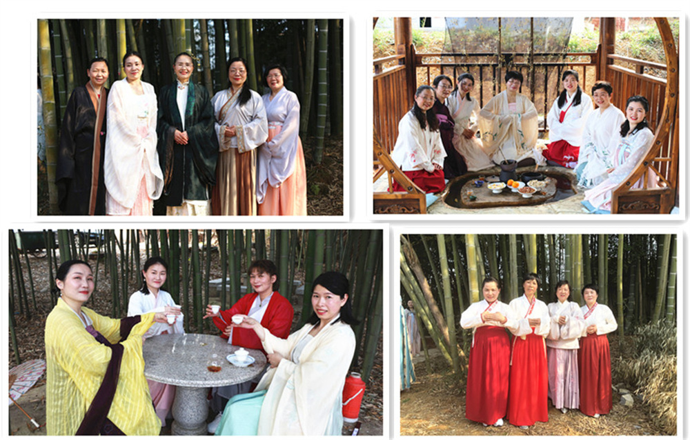 女盟員身著精美華服、邁著優雅的腳步,行走在鄉間小道、留連在翠綠竹林,賞春日景色,品曲水流觴,一顰一笑回蕩在山林間,仿佛穿越時空,回到那遙遠的時代。