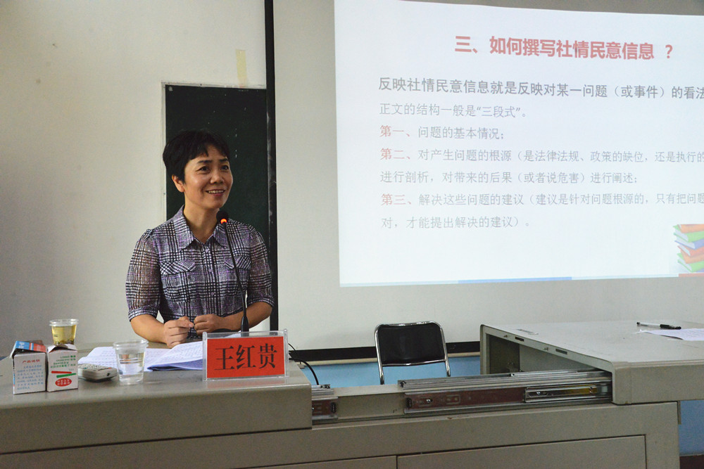 反映社情民意是民主黨派成員履行參政議政職能的重要方式。在全市民主黨派新成員培訓班上,王紅貴結合工作實際,從“為什么要寫社情民意信息”、“社情民意信息寫什么”、“怎樣寫社情民意信息”三個方面,深入淺出地為大家講述了社情民意信息的撰寫方法。課后,王紅貴應邀出席基層組織負責人座談會,并對各黨派學員代表的發(fā)言進行了點評。她肯定了基層組織負責人的黨派情懷和無私奉獻精神,希望大家學有所獲,學有所用,為婁底市的多黨合作事業(yè)做出更大的貢獻。